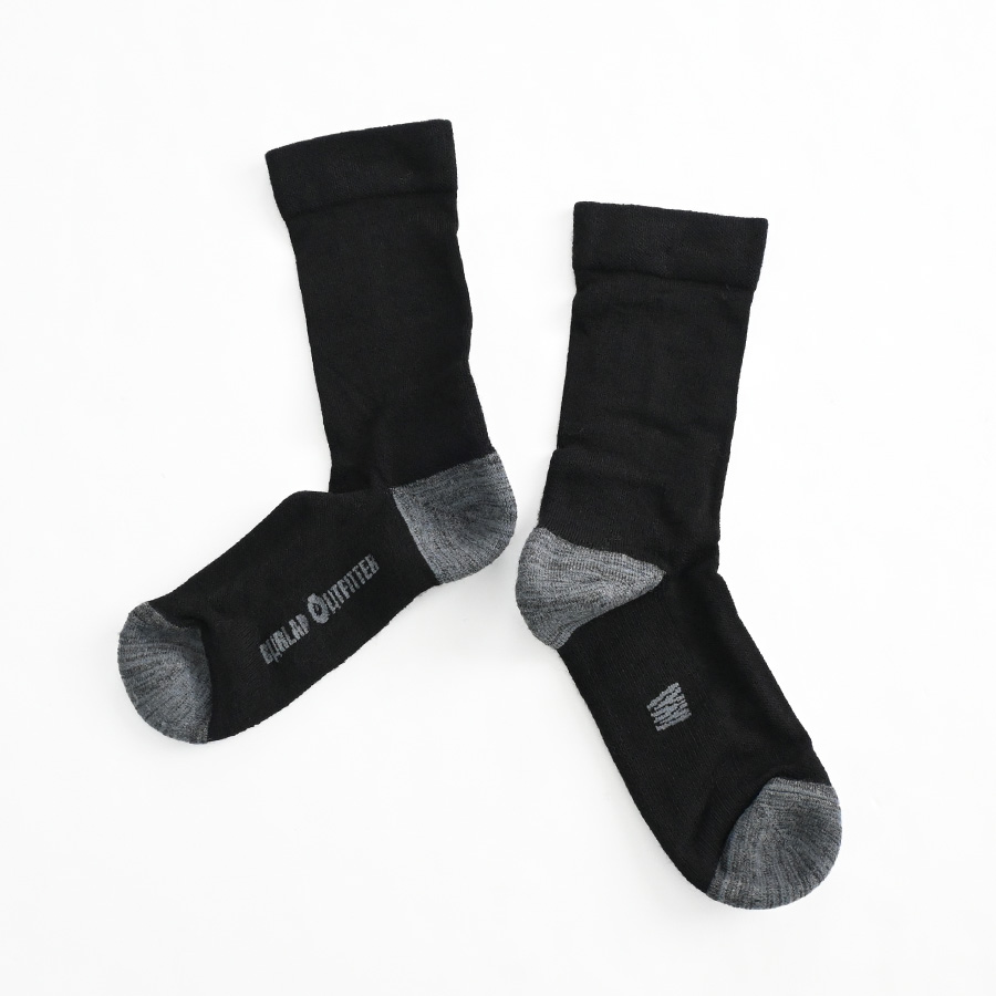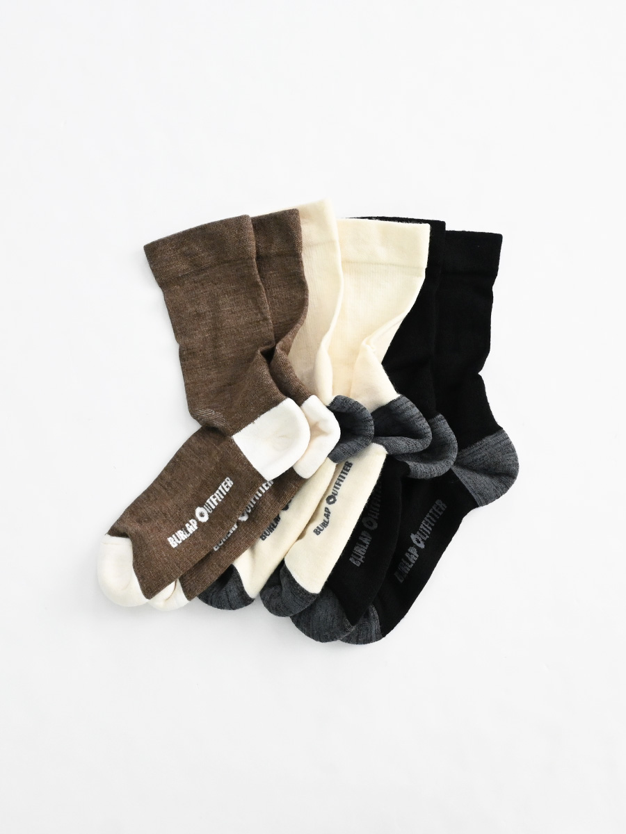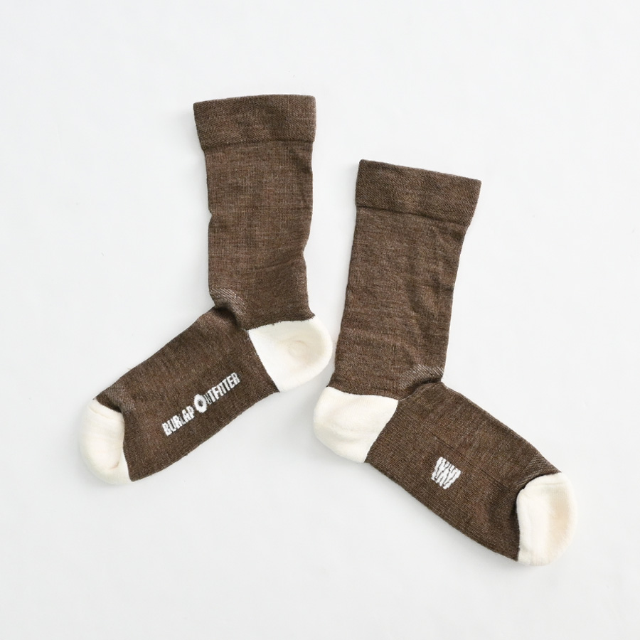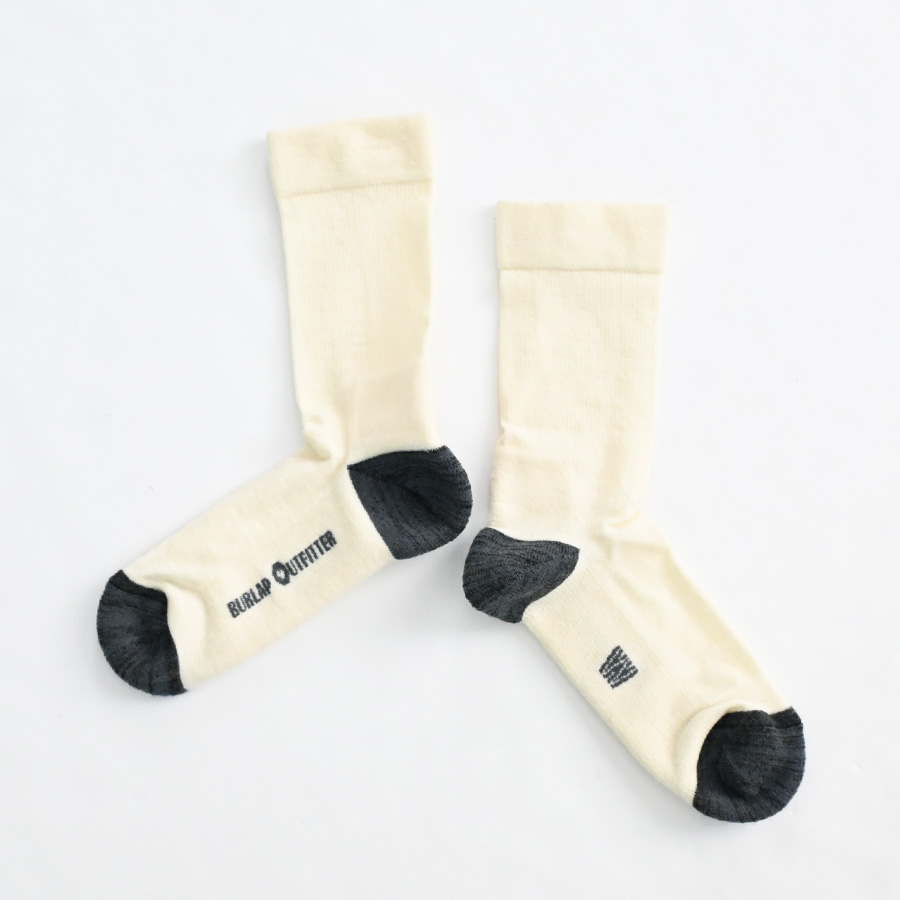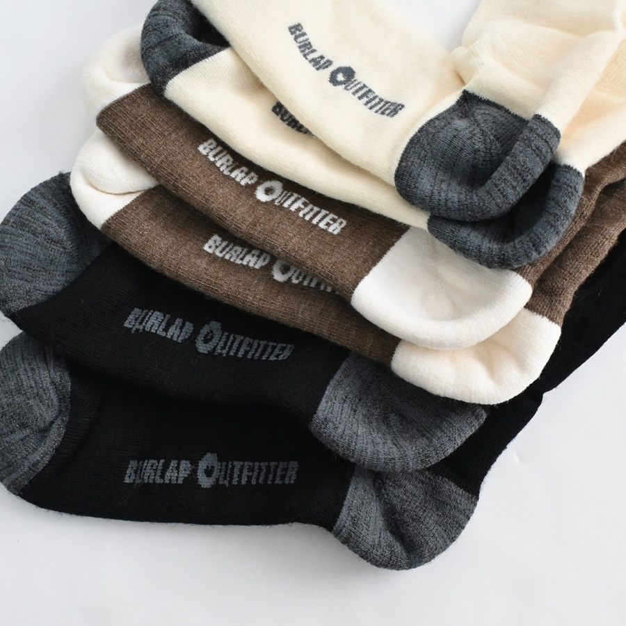 WILDERNESS WEARが培った機能的なソックスのノウハウに沿いながらも、そこはあくまでBURLAPらしく、タウンユースでの革靴やブーツのコーディネートを想定し、摩擦が起こりやすいヒール部分の生地を厚く長くし補強部分の面積を大きくしたディテールデザインに仕上げました。