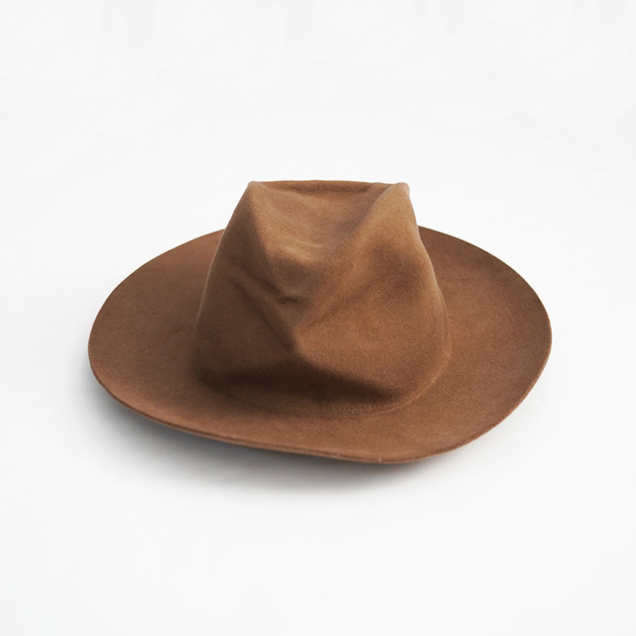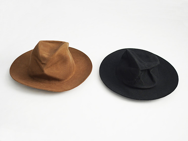 帽子を整形後、さらに潰した状態で加工し、独特なシワ感を演出しています。