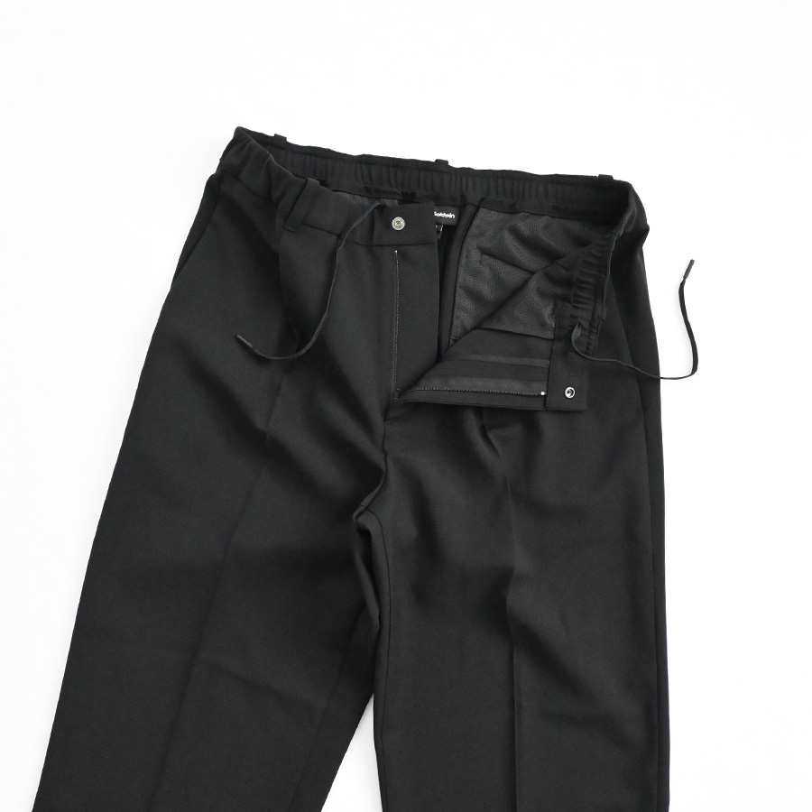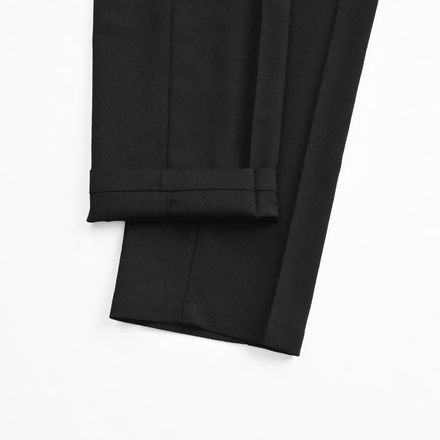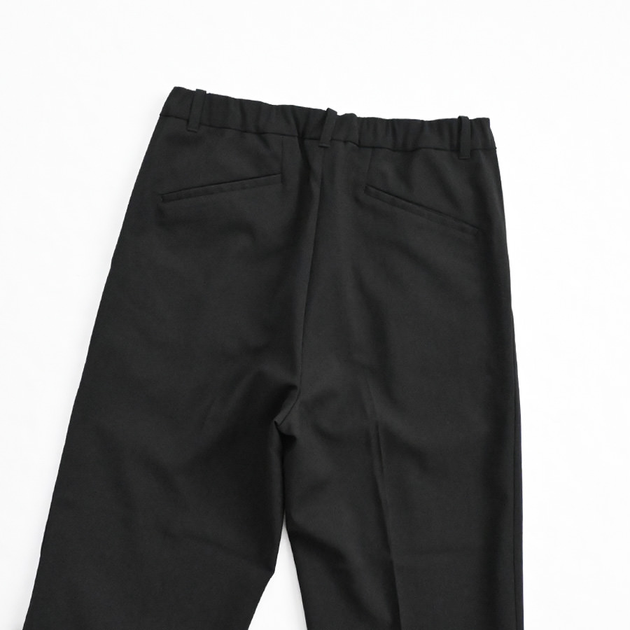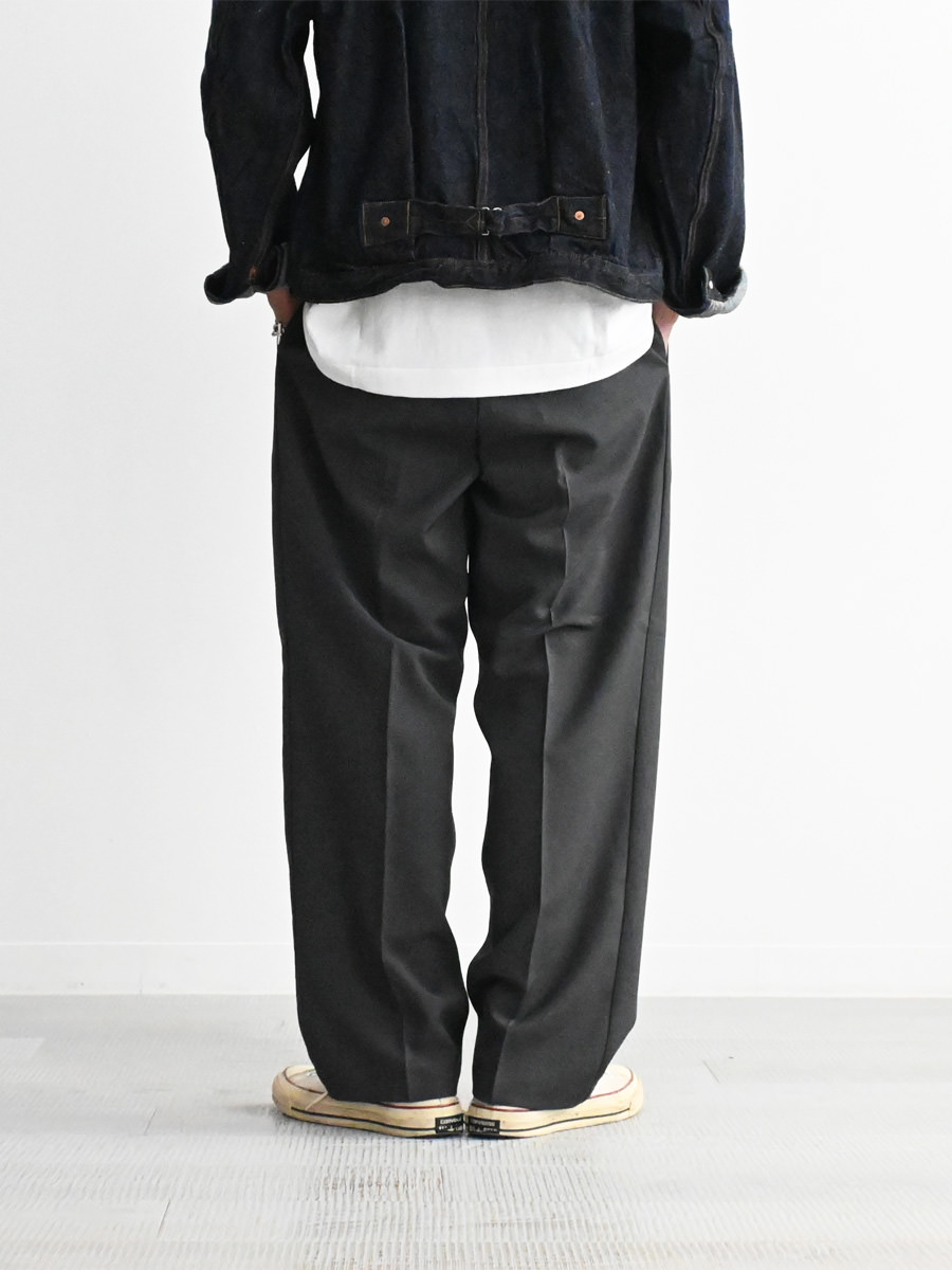 ウールのような風合いをもつポリエステル素材を使ったパンツ。