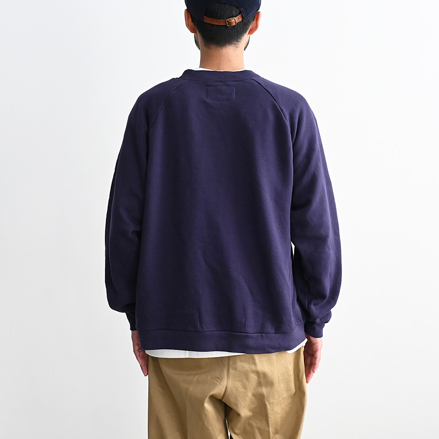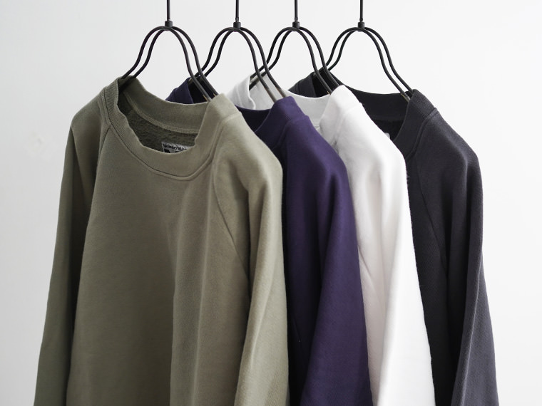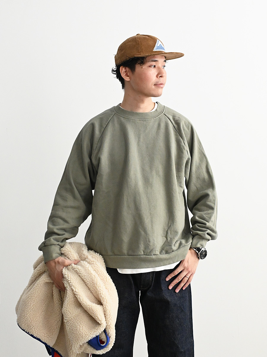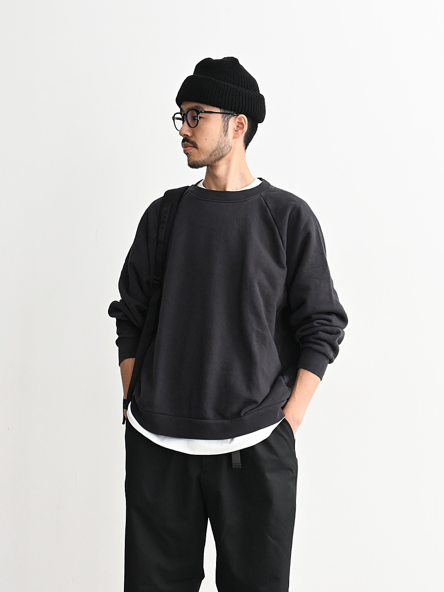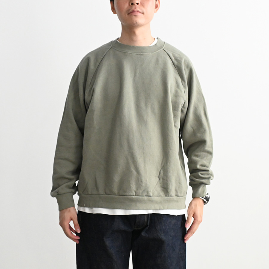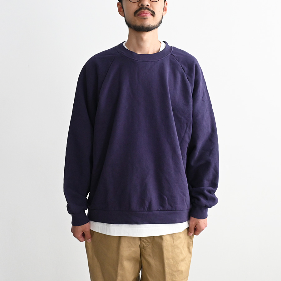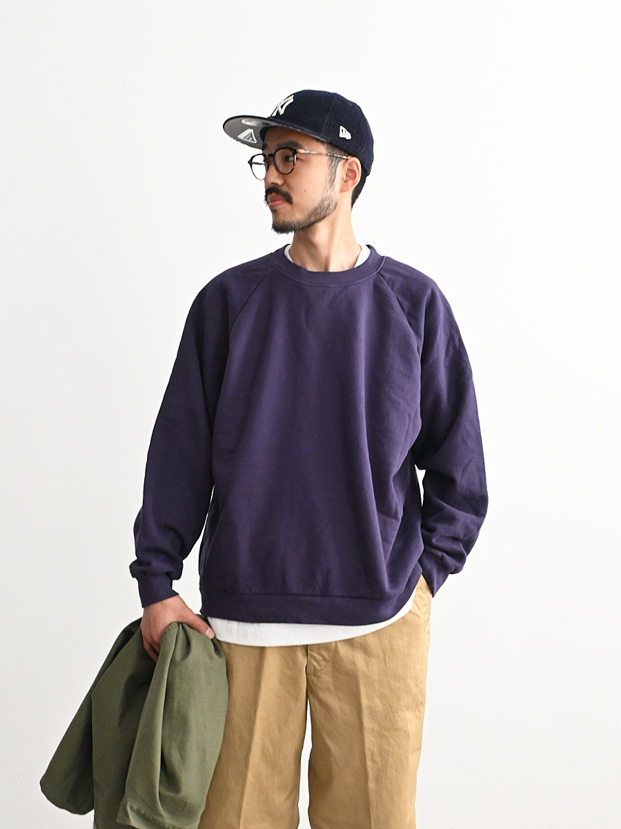 一般的なスウェットより袖先、裾のリブが短く小ぶりな仕上がりとなった非常に力の抜けたラグランスウェットです。