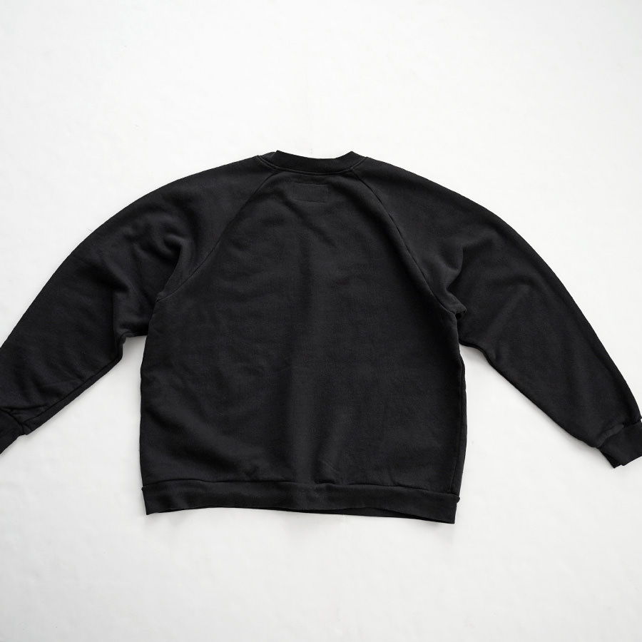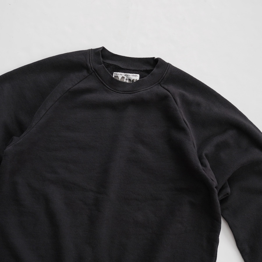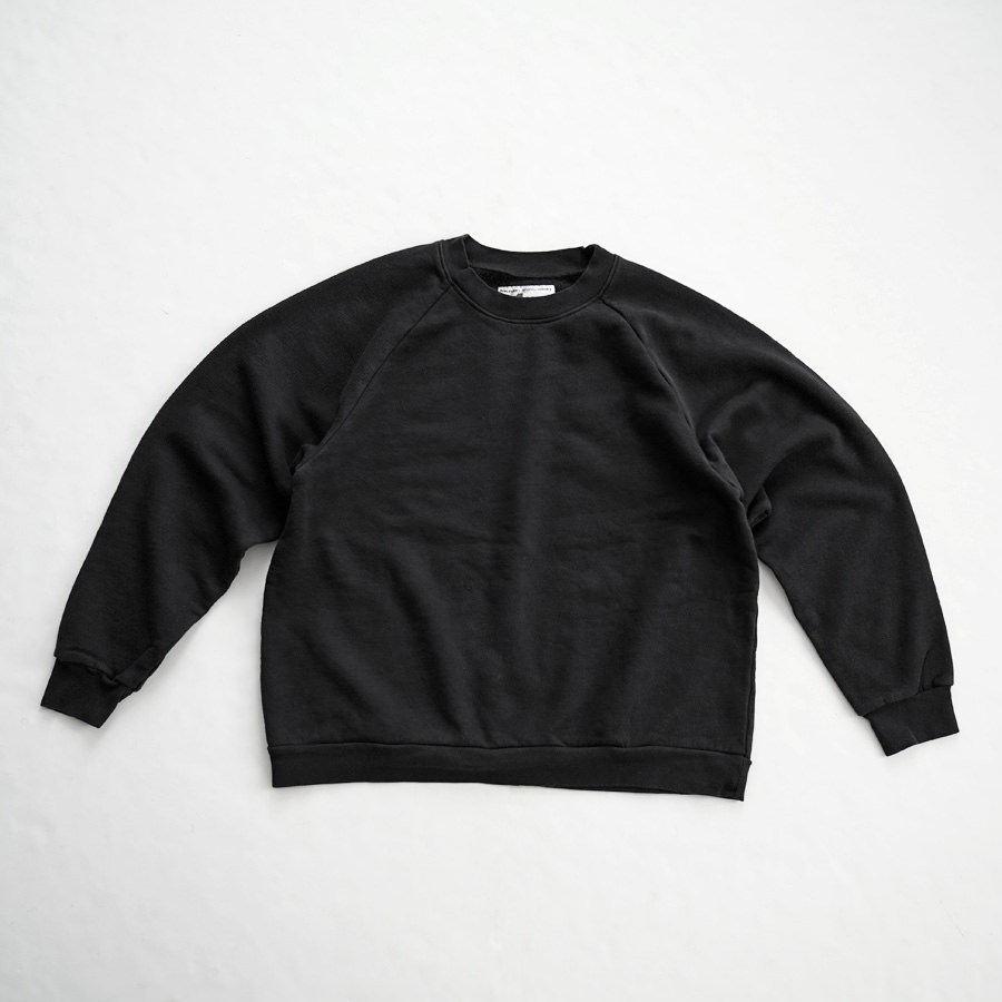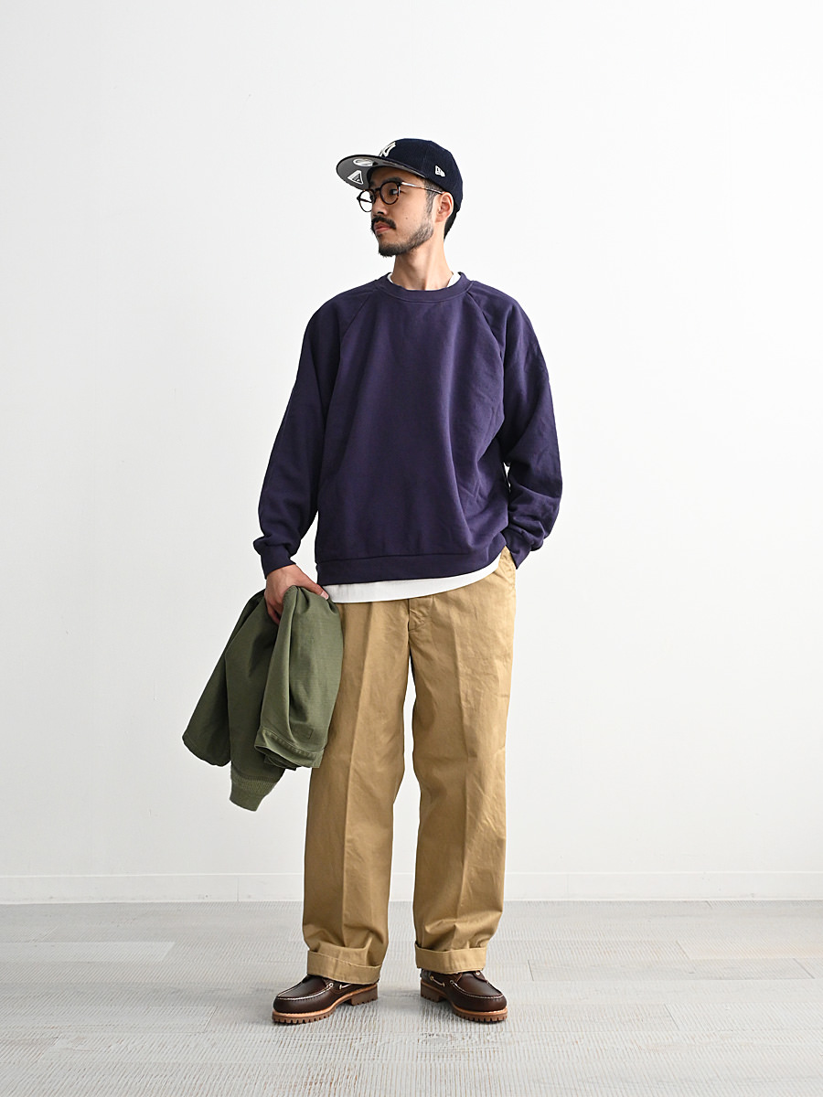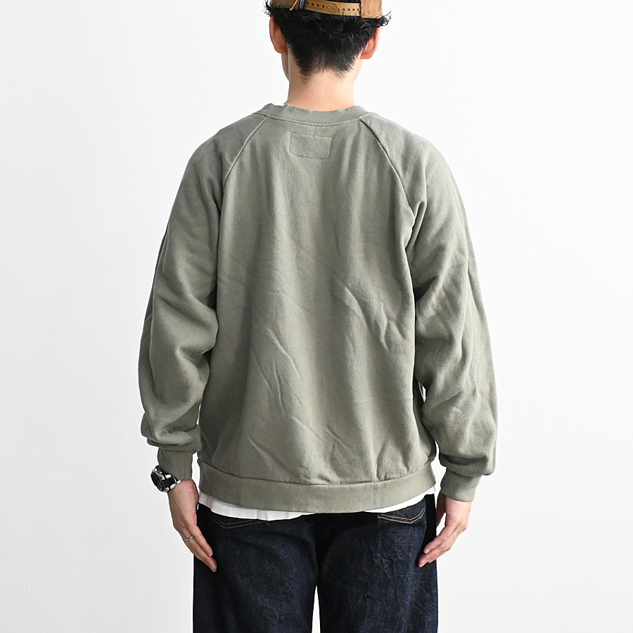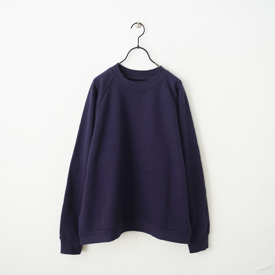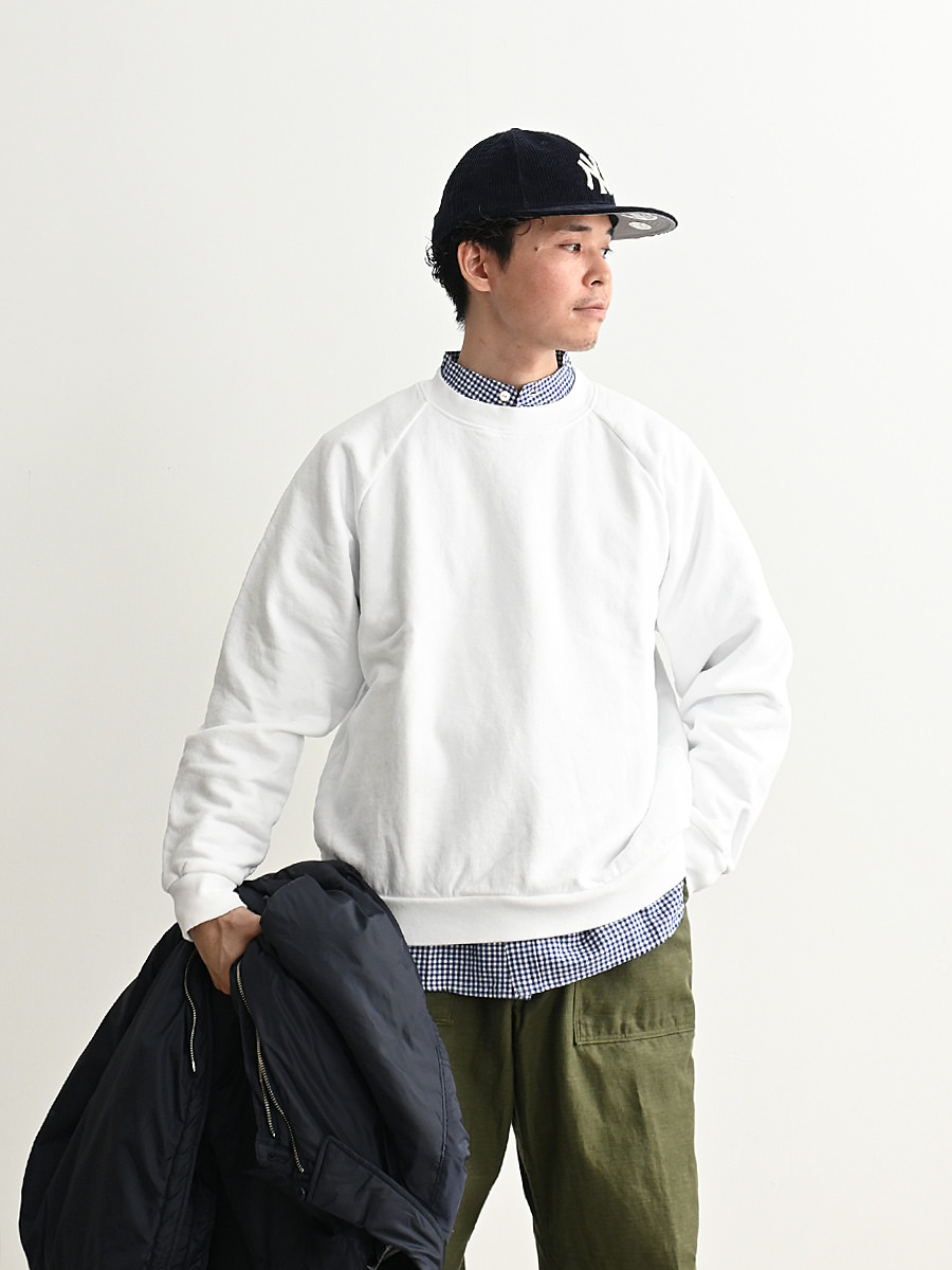 一般的なスウェットより袖先、裾のリブが短く小ぶりな仕上がりとなった非常に力の抜けたラグランスウェットです。