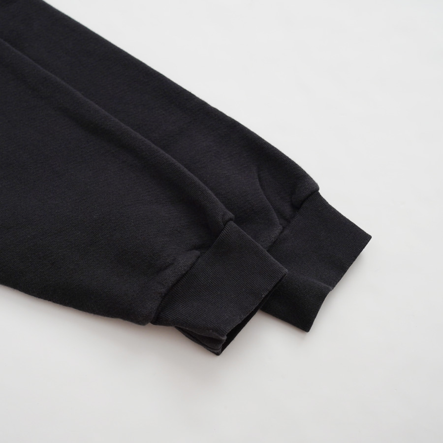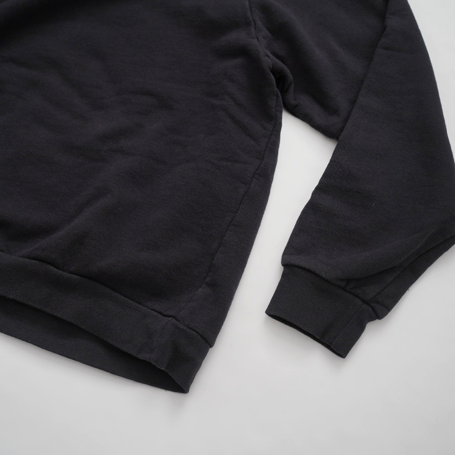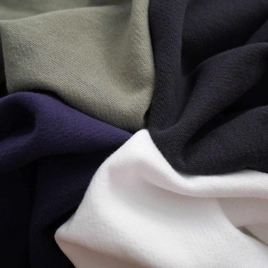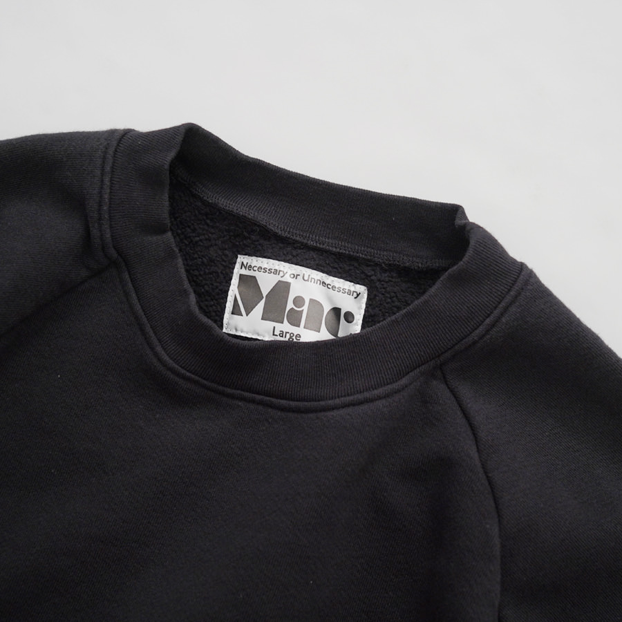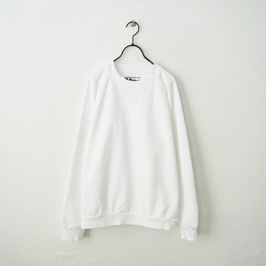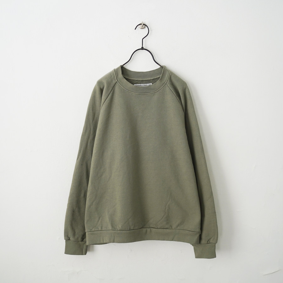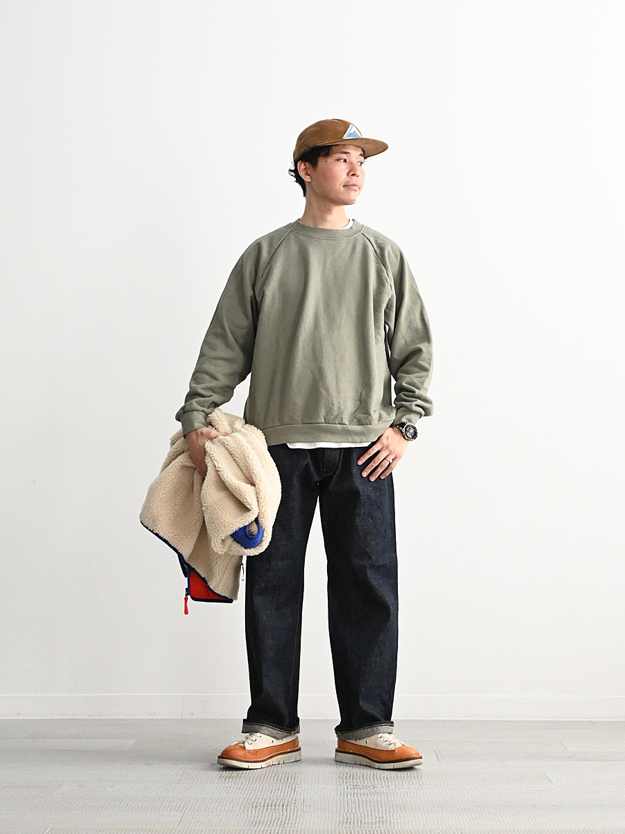 一般的なスウェットより袖先、裾のリブが短く小ぶりな仕上がりとなった非常に力の抜けたラグランスウェットです。