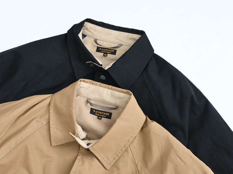 チンストラップ付の衿で、身頃と衿裏には起毛したコットンスウェード地を使うことで保温性を高めています。