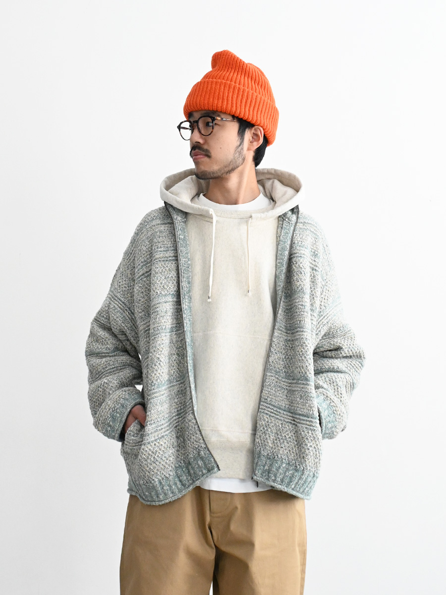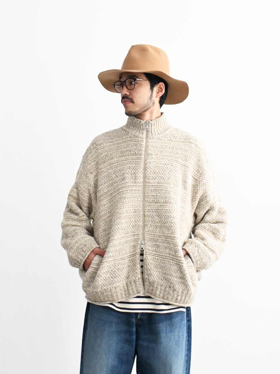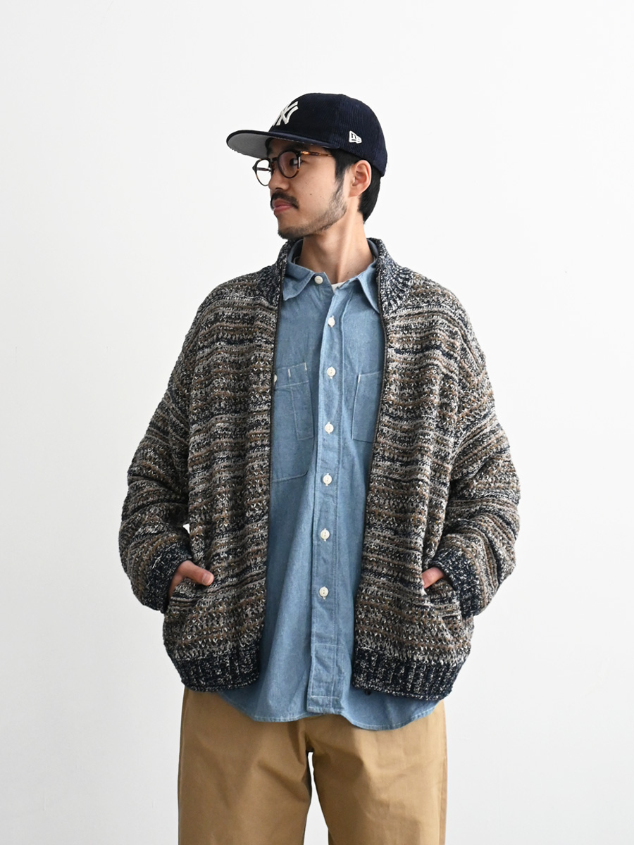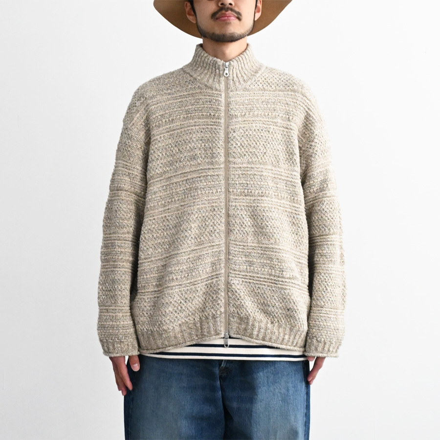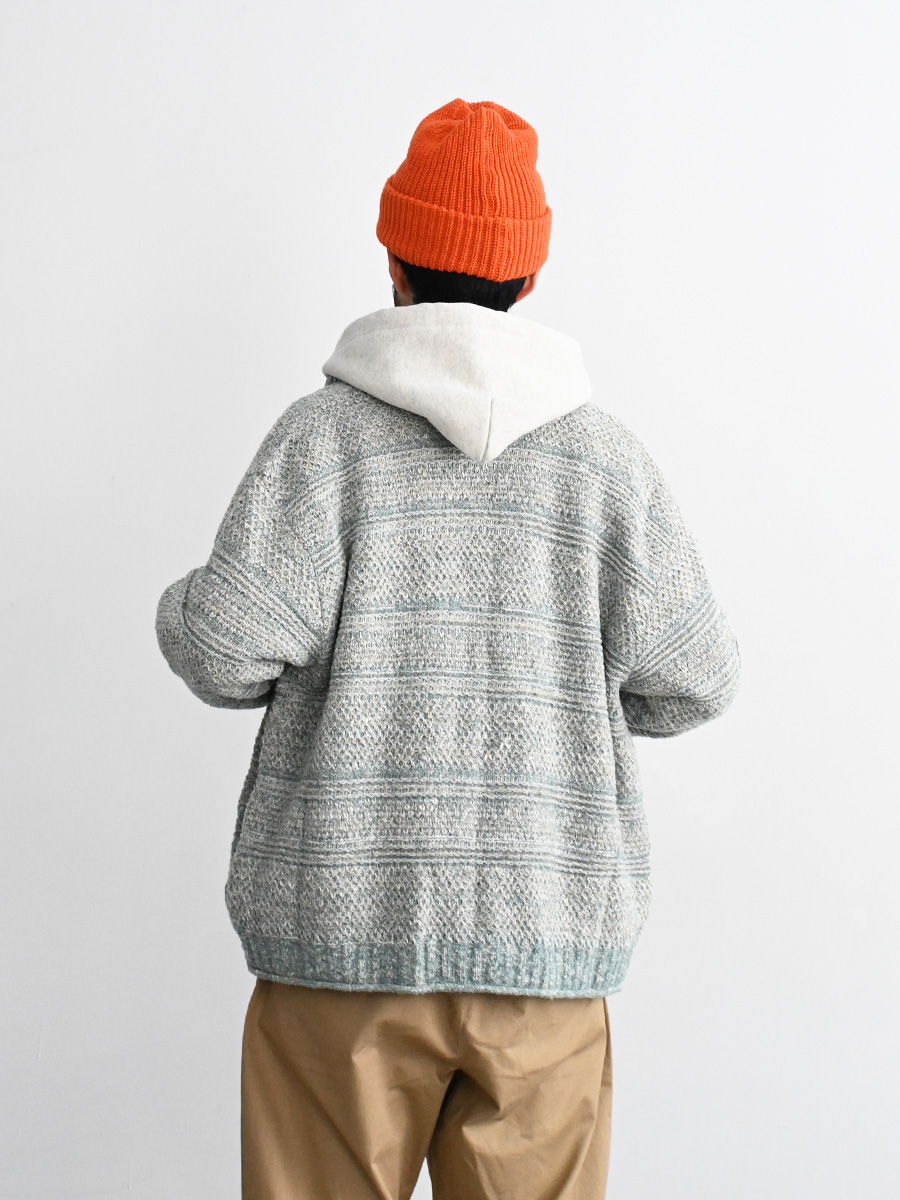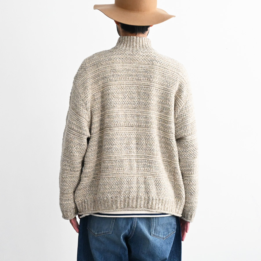 数種類の編み柄が組み合わさったマルチボーダー柄が特徴となるドライバーズニット
