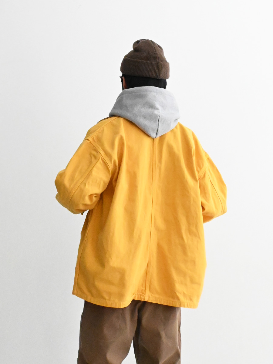 ヴィンテージカバーオールのように強度を高めたい所には3本針のステッチが入っており、フロントのポケットは左右非対称の通称『ガチャポケ』の仕様になっています。